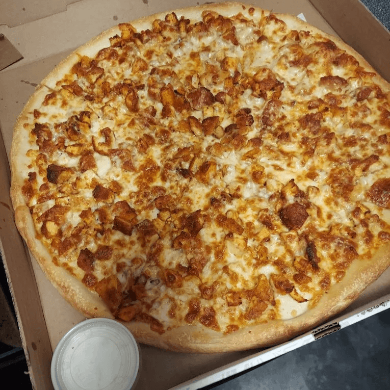 Breaded chicken cutlet, lettuce, tomato, red onion, and a side of blue cheese on a whole wheat wrap. Your choice of mild, medium, or hot