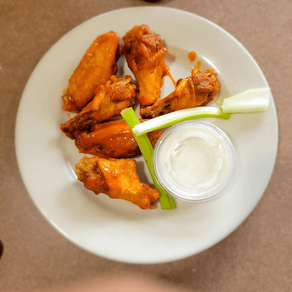 Romaine lettuce, tomatoes, cucumbers, red onion, buffalo chicken, and crumbled blue cheese. Choice of mild, medium, or hot